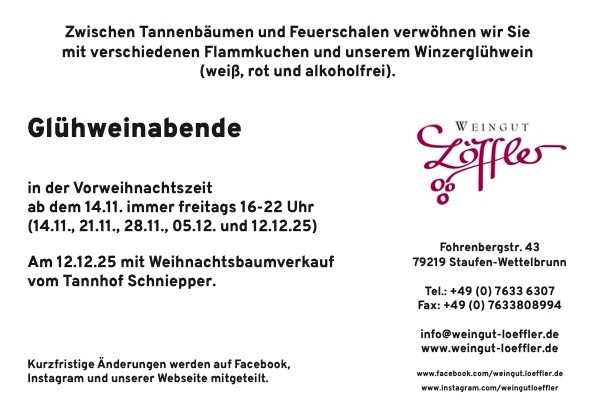 Dieses Jahr feiert die Löffler-Straußi in Staufen-Wettelbrunn ihr 30-jähriges Bestehen. Im Oktober 1995 hat die Besenwirtschaft erstmalig mit 6 Tischen, einer kleinen Vesperkarte und Weinen vom eigenen Weingut geöffnet. Die drei Geschwister Wolfgang, Christel und Bernd mit ihren Familien und einige Freunde halfen beim Start. Da die Eröffnung genau in die Ernte fiel, gab es einiges zu tun.